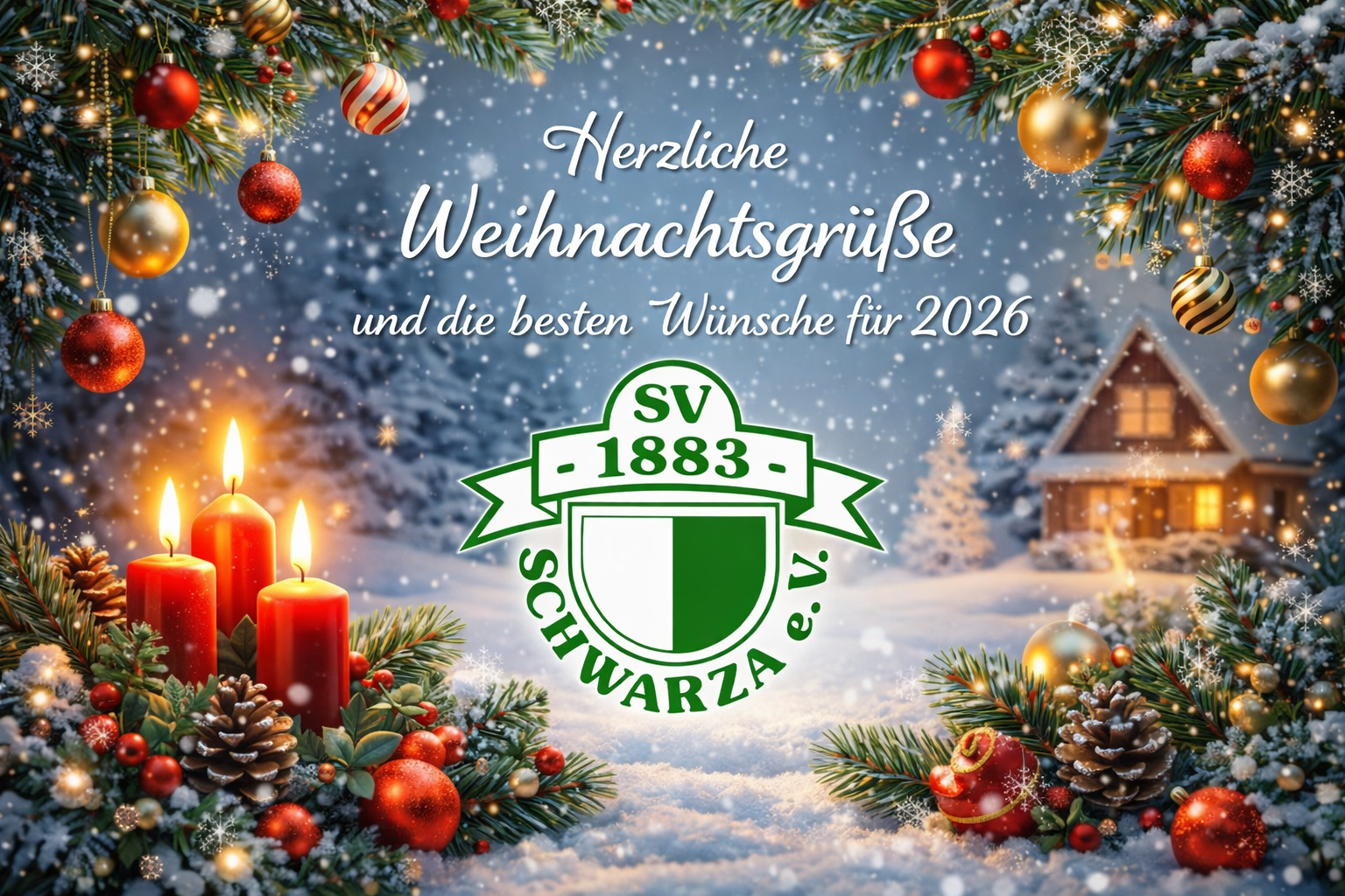 Wir möchten allen Mitgliedern und Unterstützern des SV 1883Schwarza e.V. schöne Weihnachtstage und einen guten Rutsch in das neue Jahr 2026 wünschen! Nutzt die Zeit mit Eueren Lieben, erholt Euch und schaut optimistisch in das neue Jahr –oder wie Martin Lutter einmal sagte: „Auch wenn ich wüsste, dass die Welt morgen zugrunde ginge, würde ich noch heute einen Apfelbaum pflanzen“